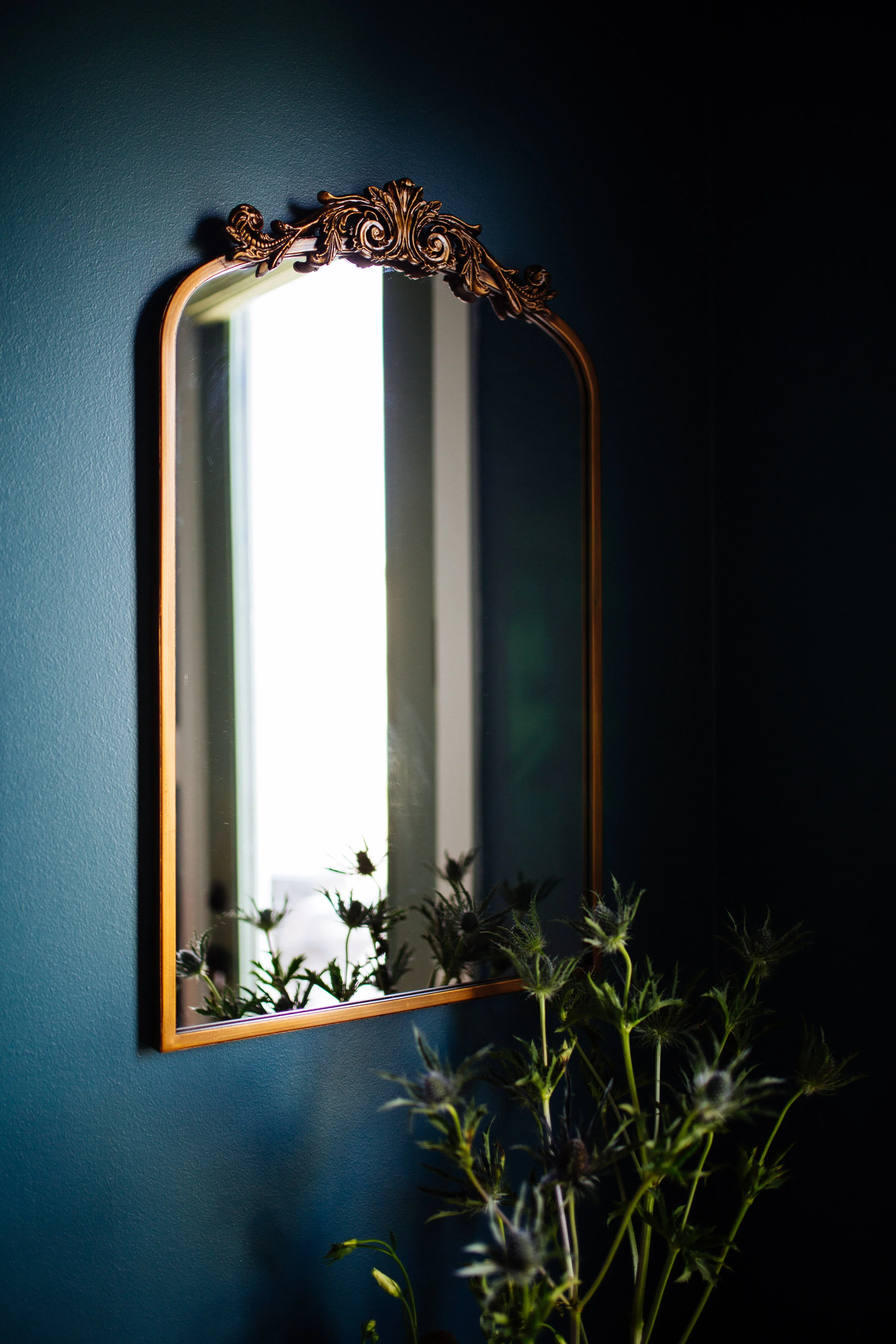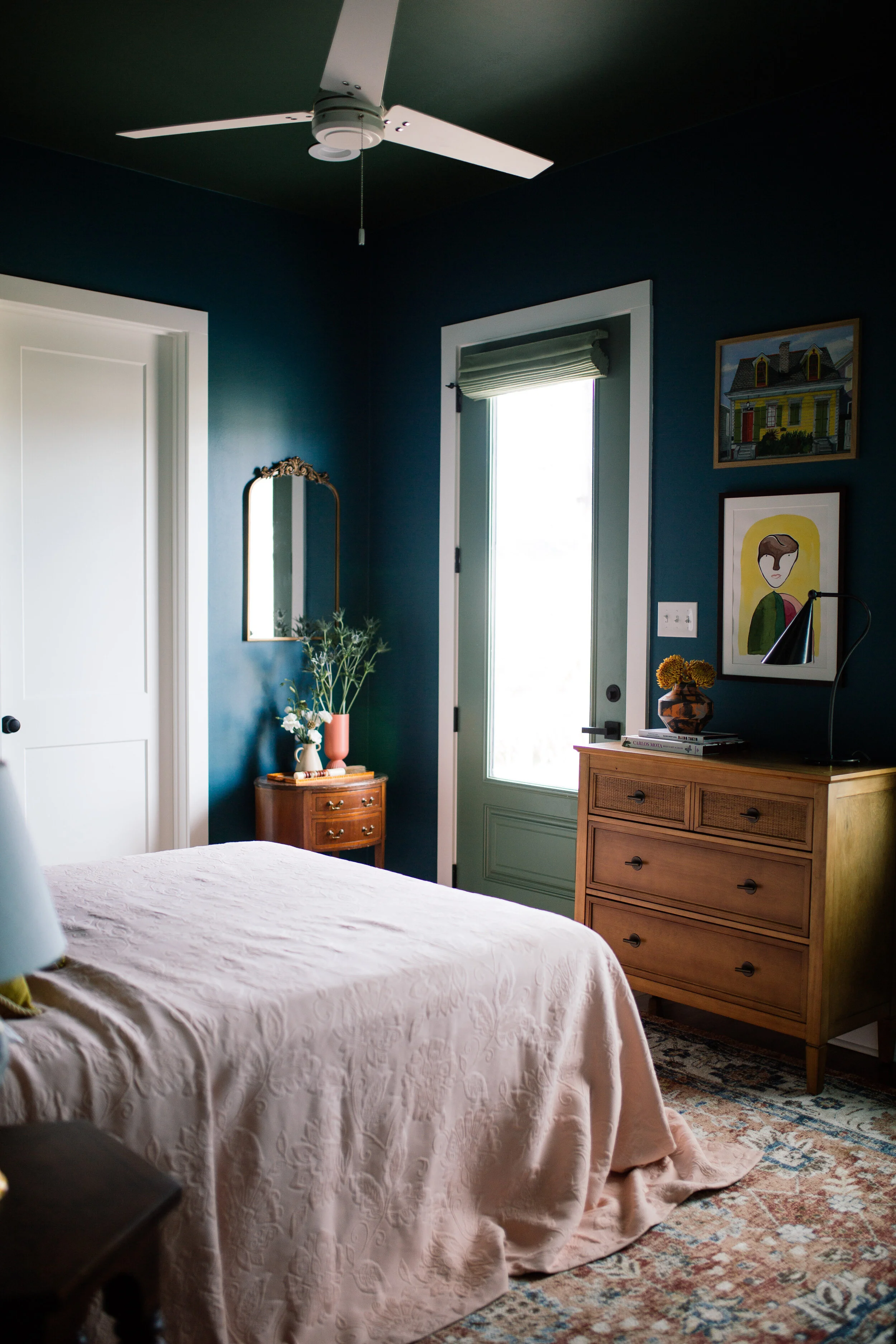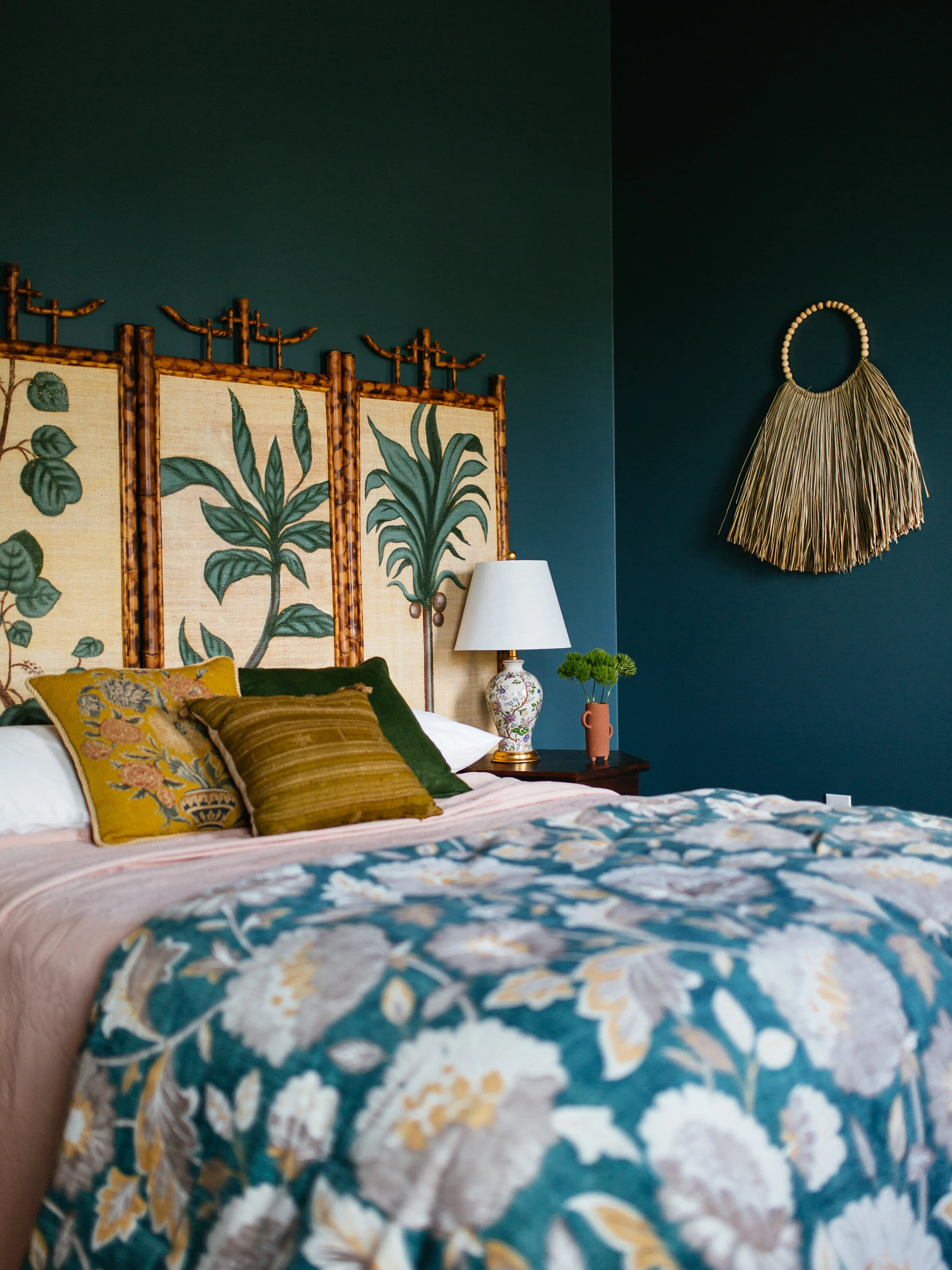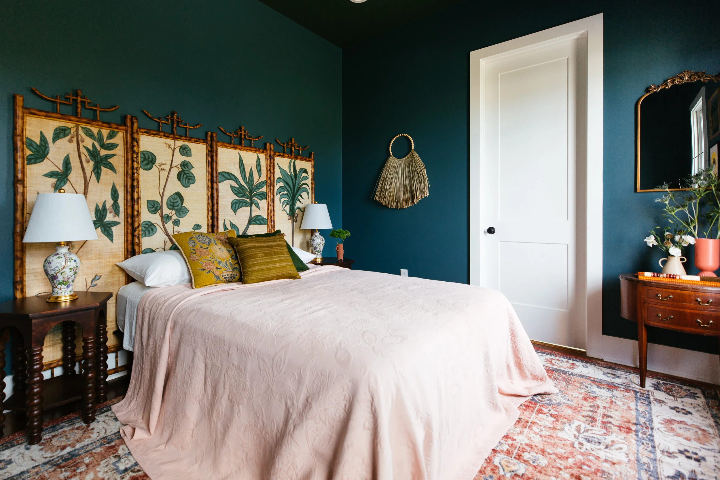 As always, I started off my design concept with a color story. You know I love greens and blues, so I stuck with my go-to palette to keep the room feeling familiar and comforting. And since I've been doing so many vibrant colors, I wanted to create a darker space. I picked out this navy blue/teal (BEHR Juniper Berries). This was my first time painting the ceiling a different color than the wall. Initially I wanted everything blue but decided to do green (BEHR Royal Orchard) up top for a fun accent. The Indonesian necklace hanging on the wall is from Whitney J Decor. The throw pillows are from Xasmin Interiors.