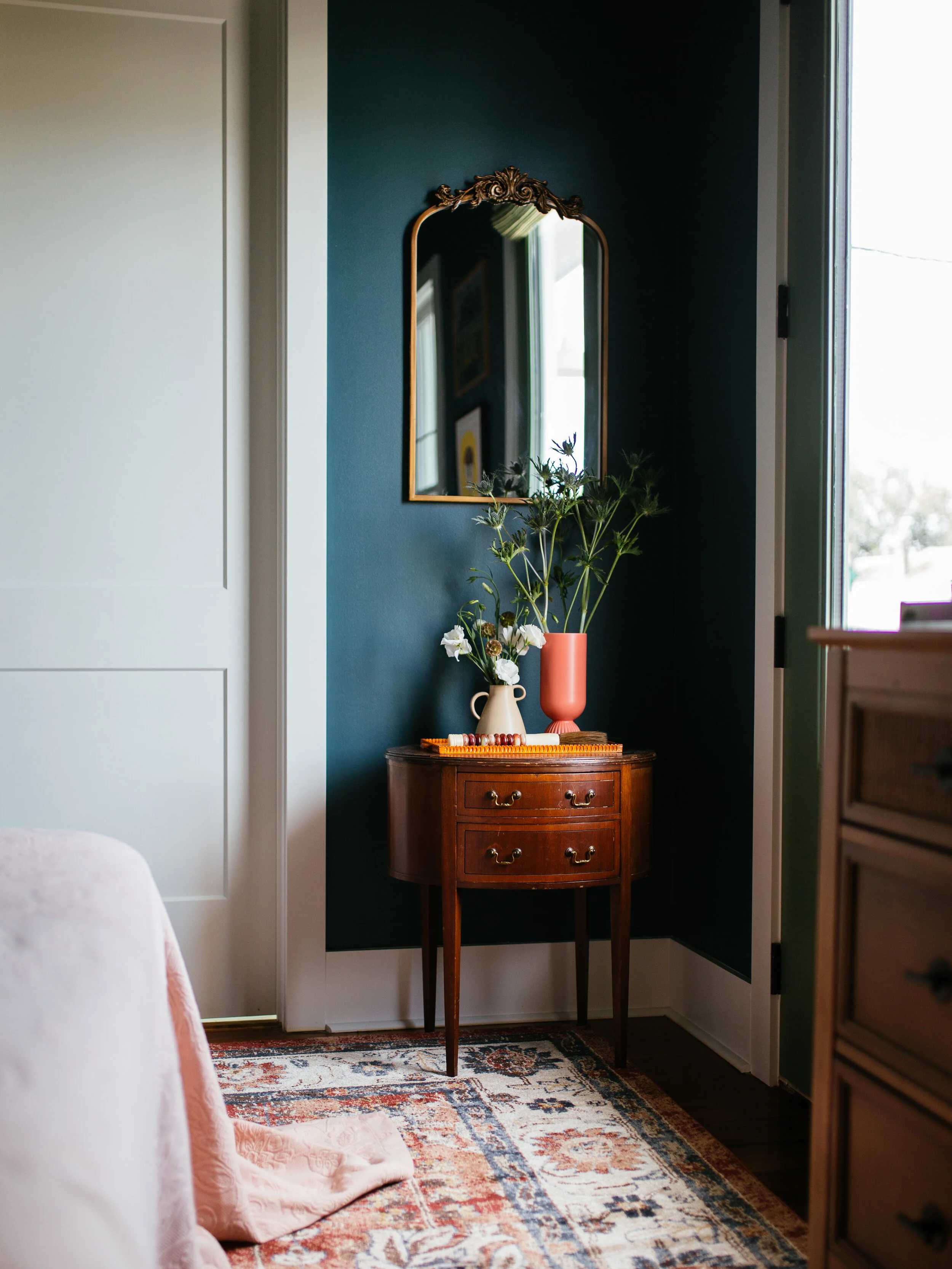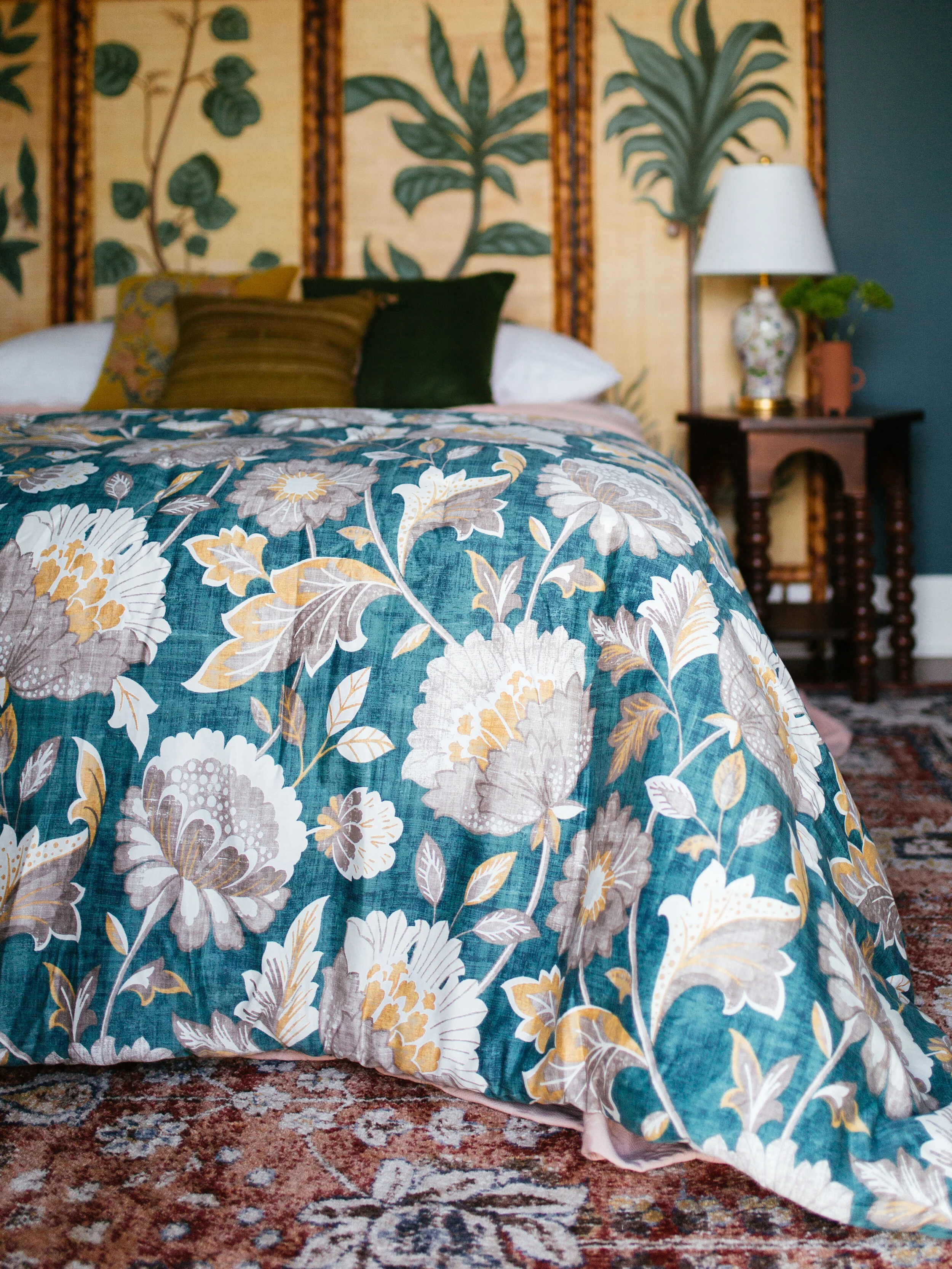 After layering all those cooler tones, I wanted to warm things up with terracotta and coral hues for a nice balance. I've always believed a good area rug is a smart way to unify a space, and this Unique Loom had everything I was looking for: The colors are perfect, it has a floral motif, and it has an antique, lived-in look that I love.