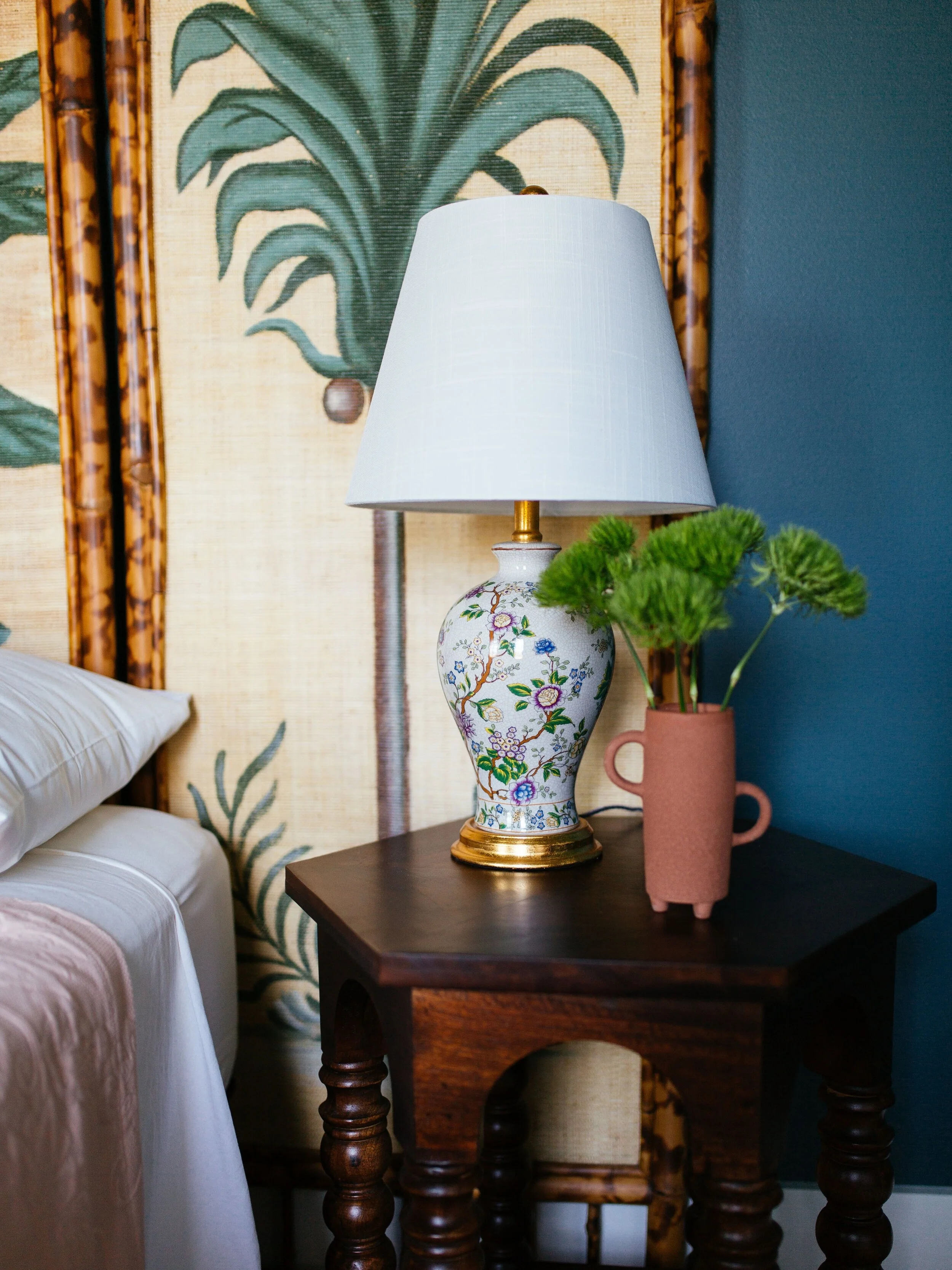 I've been on a floral kick lately. Before I even got started I knew I wanted to give the bedroom a moody, floral, romantic feel with vintage — and vintage-inspired — accents like Chinoiserie, Asian art, and other handcrafted pieces. I know from past makeovers that HomeDepot.com/decor offers exclusive decor collections that are the perfect compliment to my flea market finds.
